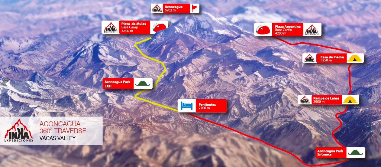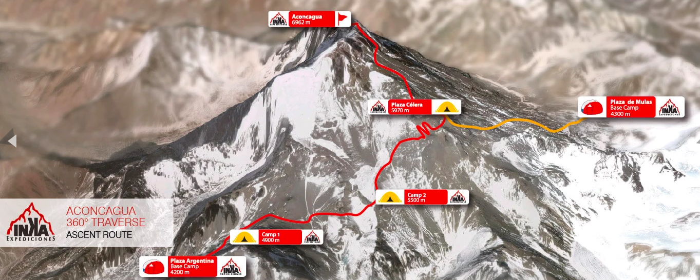 9. až 18. den - výstup údolím Vacas do základního tábora Plaza Argentina. Následně výstup přes tři výškové tábory na vrchol Aconcagui a sestup po "normálce" údolím Horcones.
